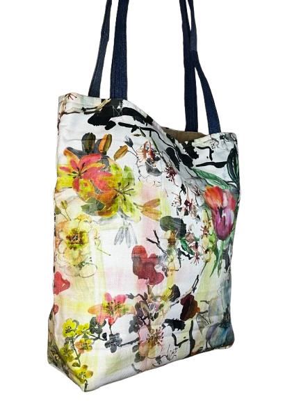 Proljetni ceker "Japanski vrt", napravljen je od pamučnog platna, ima podstavu od popelina sa unutarnjim džepom i čvrstim dnom koje je potrebno izvaditi prije pranja. Može se prati u perilici. Djelomično recikliran jer su mu ručke stare traperice.