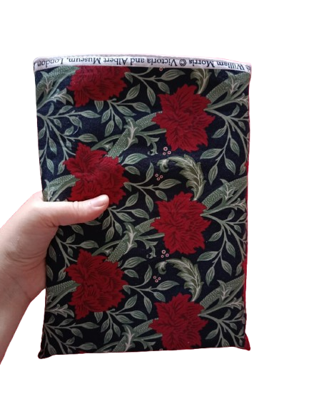 Praktičan detalj za sve one koji vole čuvati svoje knjige, omot-vrećica koja će nježno zagrliti vaše omiljeno štivo i sačuvati ga od habanja i gužvanja u torbi ili ruksaku. Napravljen je od pamučne tkanine iz poznate linije William Morris od 100 % pamuka, te je ovaj sa prekrasnim crvenim karanfilima, te se može oprati. Jedna strana je pojačana čvršćim stabilizatorom.