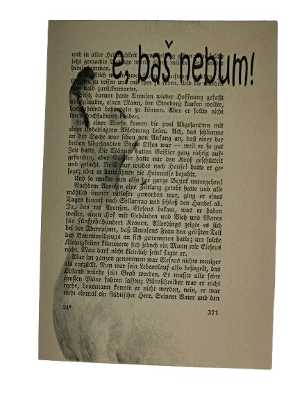 Unikatni art print izrađen na originalnom listu iz stare knjige tiskanom njemačkom goticom. Svaki list je jedinstven, a preko njega je ručno otisnut motiv pesonje i natpis "e, baš nebum" – tipičan izraz zagrebačkog govora koji nosi toplinu i humor svakodnevice, a pogotovo trvrdoglavost pojedninaca.